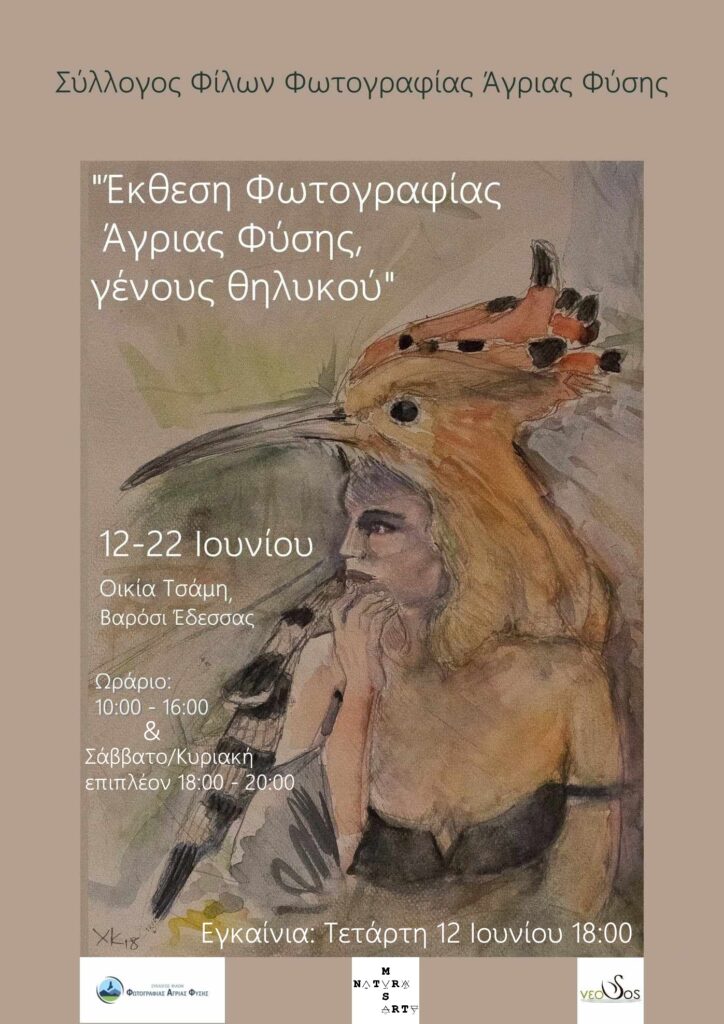 Ο Σύλλογος Φίλων Φωτογραφίας Άγριας Φύσης, σε συνεργασία με τον Σύλλογο Προστασίας Υδρολογικού Συστήματος Εδεσσαίου ποταμού “νεοSOS” και το δίκτυο “Natura MusArte“, διοργανώνουν Έκθεση φωτογραφίας με τίτλο : Φωτογραφία Άγριας Φύσης «Γένους Θηλυκού», από τις 12/6 έως τις 22/6, στην οικία Τσάμη, στο Βαρόσι Έδεσσας.