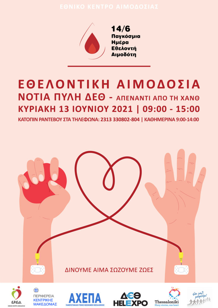 H Περιφέρεια Κεντρικής Μακεδονίας με πρωτοβουλία της Αντιπεριφερειάρχη της Μητροπολιτικής Ενότητας Θεσσαλονίκης Βούλας Πατουλίδου και του Αντιπεριφερειάρχη Υγείας Χρήστου Μήττα διοργανώνουν μαζί με το Εθνικό Κέντρο Αιμοδοσίας, το Πανεπιστημιακό Γενικό Νοσοκομείο Θεσσαλονίκης «ΑΧΕΠΑ», τον Οργανισμό Τουρισμού Θεσσαλονίκης, το «Όλοι μαζί μπορούμε» και τη ΔΕΘ HELEXPO A.E. την τέταρτη έκτακτη εθελοντική αιμοδοσία, η οποία είναι αφιερωμένη στον ανώνυμο εθελοντή αιμοδότη, την Κυριακή 13 Ιουνίου 2021 στις ώρες 09.00-15.00 στη Νότια Πύλη της Δ.Ε.Θ. (απέναντι από τη Χ.Α.Ν.Θ.).