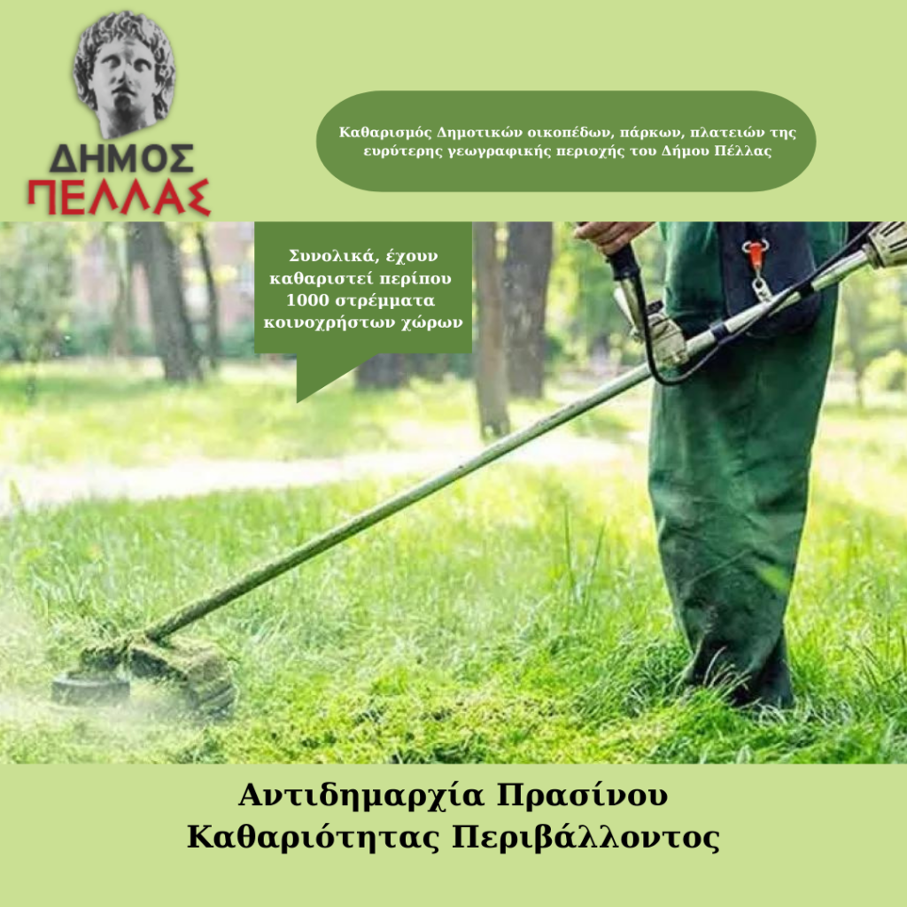 Η Διεύθυνση Περιβάλλοντος, Πρασίνου και Καθαριότητας του Δήμου Πέλλας ενημερώνει ότι έχει προβεί στον καθαρισμό δημοτικών οικοπέδων, πάρκων, πλατειών στα όρια της ευρύτερης γεωγραφικής περιοχής του. Συνολικά, έχουν καθαριστεί περίπου 1.000 στρέμματα κοινοχρήστων χώρων, ιδιοκτησίας Δήμου Πέλλας.