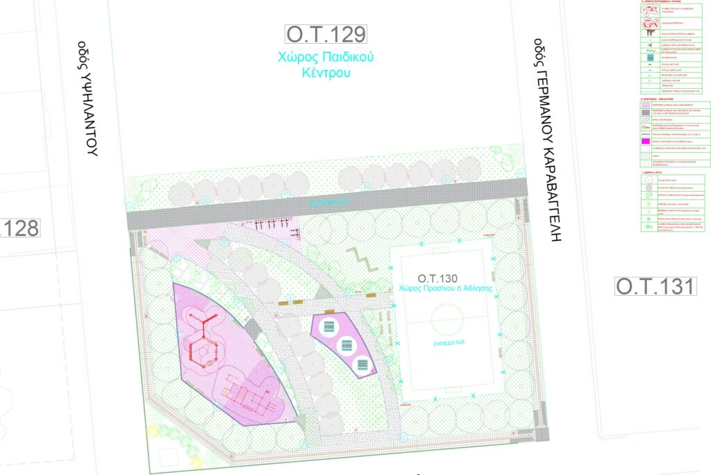 Η πρόταση της δημοτικής αρχής, είναι συνολικού προϋπολογισμού 414.586,39 € και περιλαμβάνει την δημιουργία ενός χώρου αναψυχής για εφήβους και παιδιά, με τη δημιουργία ποδοσφαιρικού γηπέδου 5×5, τοποθέτηση οργάνων γυμναστικής, κατασκευή κτιστών καθισμάτων, τοποθέτηση κάδων απορριμμάτων, βρυσών, σταντ για ποδήλατα κλπ. και την κατάλληλη φύτευση του χώρου με καλλωπιστικά δέντρα και θάμνους τα οποία είναι ανθεκτικά στις κλιματολογικές συνθήκες της περιοχής. Ακόμη προβλέπεται η επίστρωση των δαπέδων του κυρίου διαδρόμου με κυβόλιθο και στους χώρους άθλησης, η τοποθέτηση ελαστικών δαπέδων ασφαλείας.