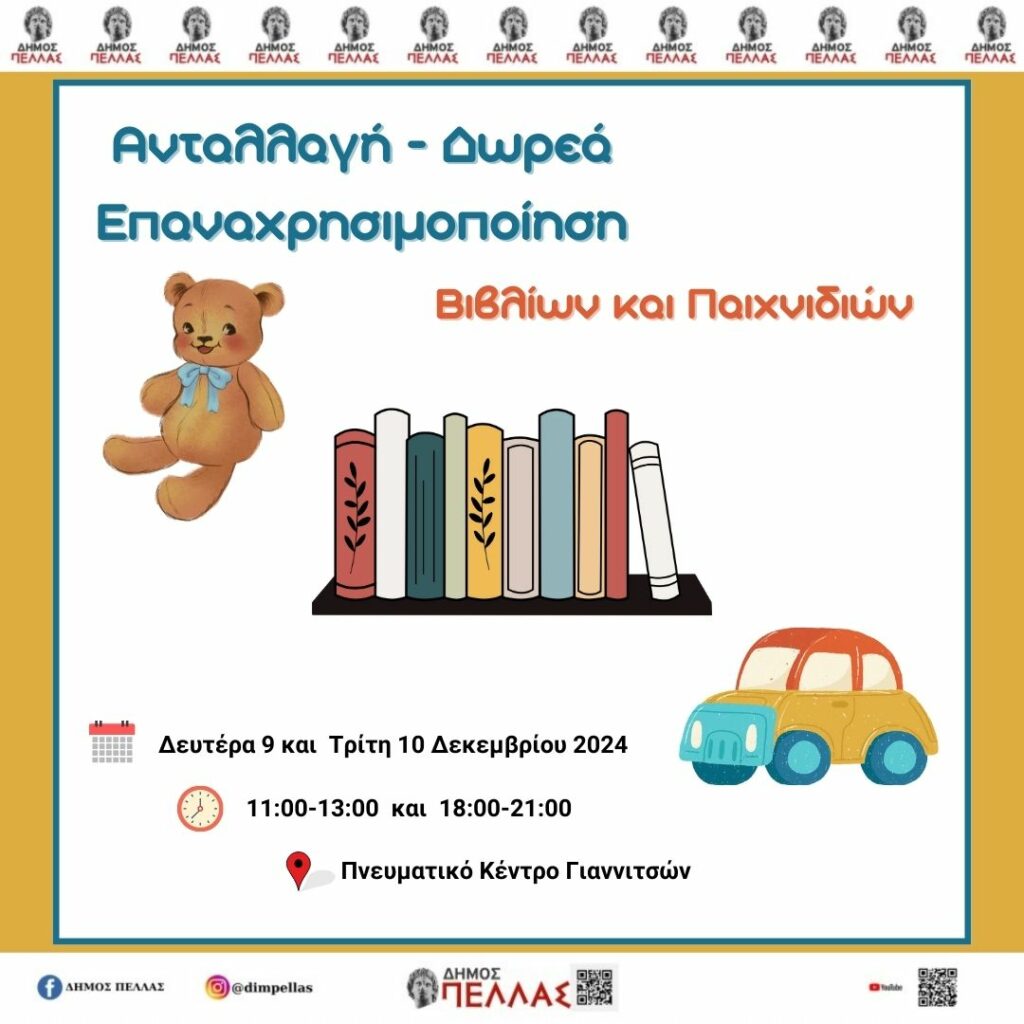 Ο Δήμος Πέλλας, συνεχίζοντας την προώθηση των αρχών της Κυκλικής Οικονομίας και στοχεύοντας στην ενίσχυση της αλληλεγγύης και της προστασίας του περιβάλλοντος, διοργανώνει για 3η συνεχόμενη χρονιά τη δράση “Ανταλλαγή/Δωρεά/Επαναχρησιμοποίηση Βιβλίων και Παιχνιδιών.