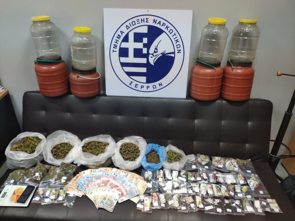 Ειδικότερα, μετά από συντονισμένες ενέργειες των αστυνομικών, πραγματοποιήθηκε έρευνα στην οικία του ημεδαπού, με την συνδρομή αστυνομικού σκύλου ανίχνευσης ναρκωτικών της Διεύθυνσης Αστυνομίας Σερρών, στην οποία εντοπίσθηκαν 56 αυτοσχέδιες συσκευασίες και διάφορες ποσότητες κάνναβης.