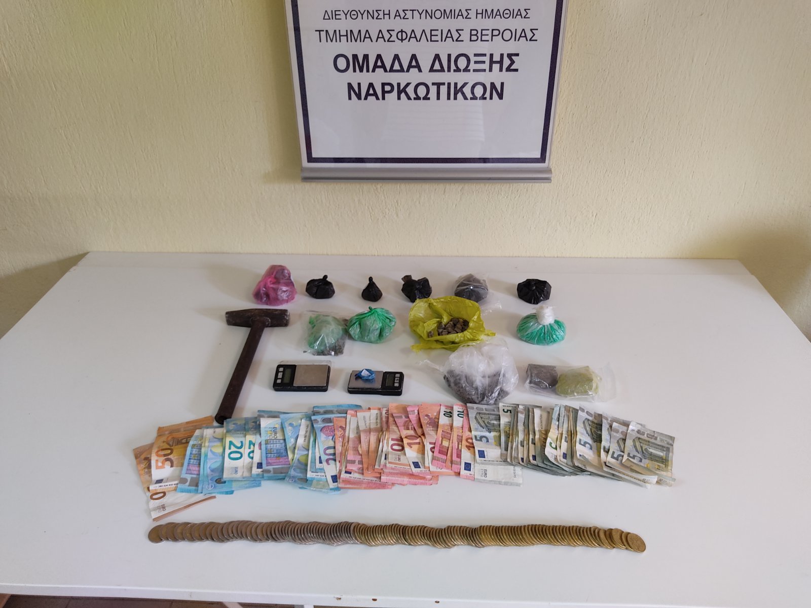 Επίσης βρέθηκαν και κατασχέθηκαν 2 ηλεκτρονικές ζυγαριές ακριβείας με υπολείμματα ηρωίνης, ένα σφυρί που χρησιμοποιούνταν για το σπάσιμο της ηρωίνης και το χρηματικό ποσό των 1.058 ευρώ.