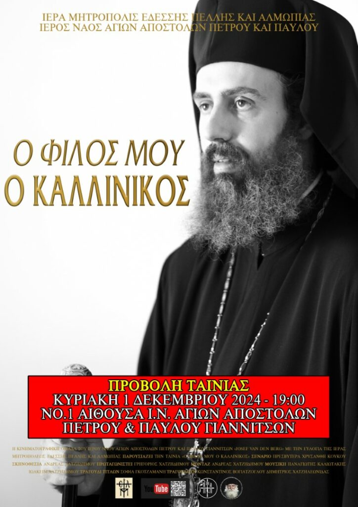 Την Κυριακή 1 Δεκεμβρίου, στις 19.00, θα προβληθεί στην αίθουσα του ιερού ναού Αγίων Αποστόλων Πέτρου και Παύλου Γιαννιτσών η ταινία: