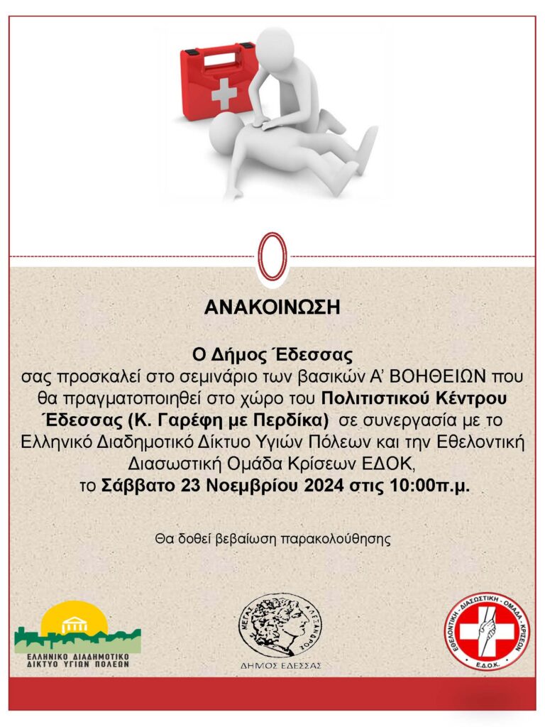 Ο Δήμος Έδεσσας σε συνεργασία με το Ελληνικό Διαδημοτικό Δίκτυο Υγιών Πόλεων και τους διασώστες της Εθελοντικής Διασωστικής Ομάδας Κρίσεων ΕΔΟΚ, διοργανώνει διήμερο σεμινάριο το Σαββατοκύριακο 23-24 Νοεμβρίου 2024 ως εξής: