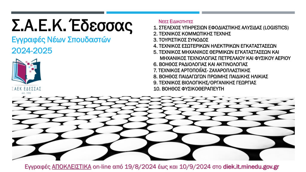 Συνεχίζεται η ΗΛΕΚΤΡΟΝΙΚΗ υποβολή αιτήσεων για εγγραφή στις ΝΕΕΣ ΕΙΔΙΚΟΤΗΤΕΣ της Σχολής Ανώτερης Επαγγελματικής Κατάρτισης Έδεσσας (Σ.Α.Ε.Κ. Έδεσσας – πρώην Ι.Ε.Κ.) για όσους θέλουν να σπουδάσουν κατά το ακαδημαϊκό έτος 2024-25. Το ηλεκτρονικό σύστημα θα δέχεται εγγραφές μέχρι και την ΤΡΙΤΗ 10 Σεπτεμβρίου 2024 και ώρα 15:00.