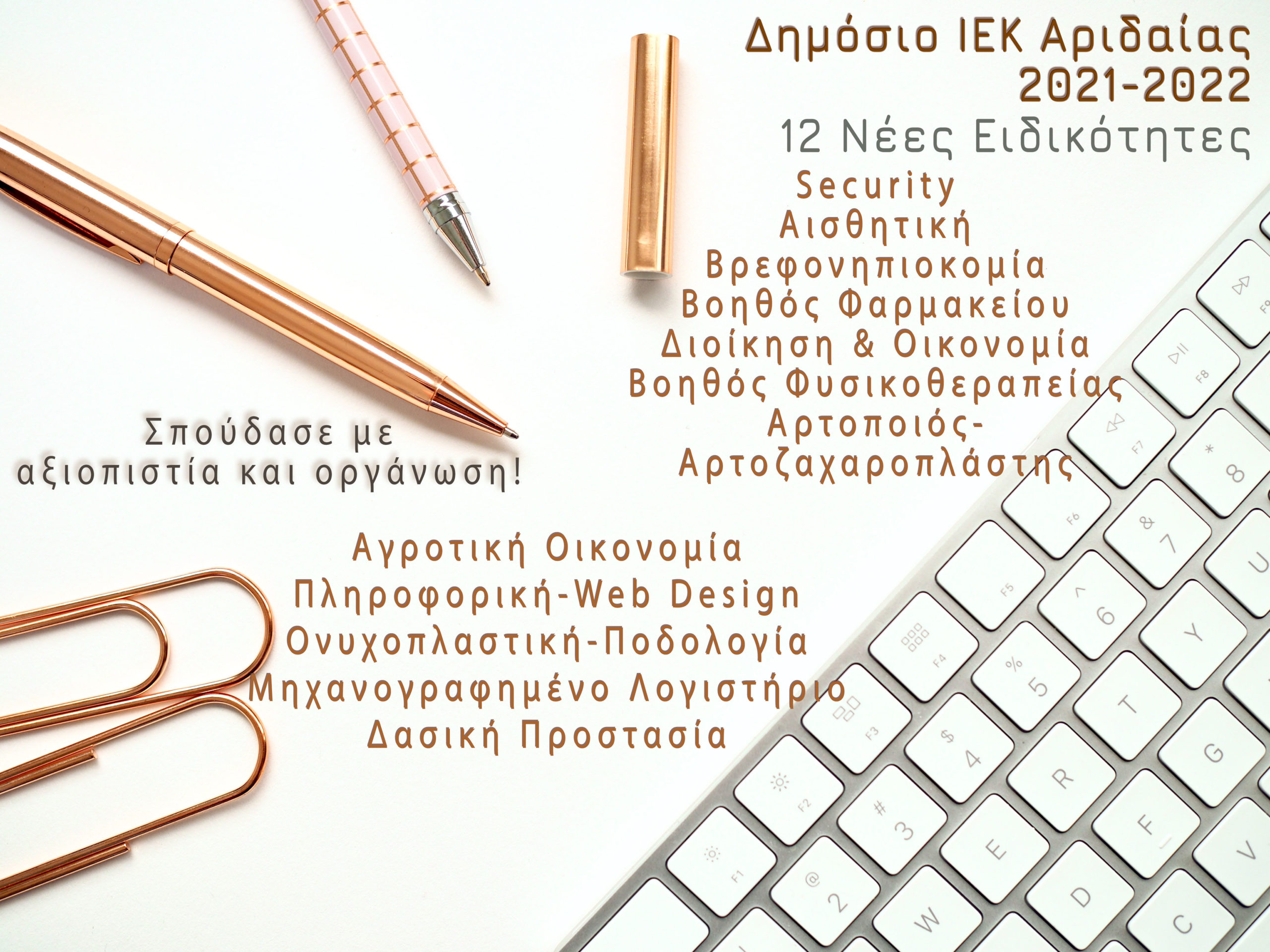 Περιμένουμε να σας γνωρίσουμε ως σπουδαστές του ΔΙΕΚ ΑΡΙΔΑΙΑΣ με τη βεβαιότητα ότι η επιλογή σας θα συνδράμει καταλυτικά στην επαγγελματική σας εξέλιξη!