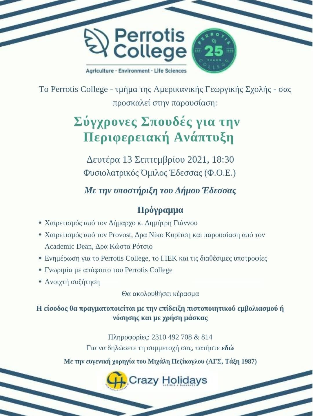 Ενημερωτική εκδήλωση με τίτλο: «Σύγχρονες σπουδές για την περιφερειακή ανάπτυξη», διοργανώνει το Perrotis College. Θα πραγματοποιηθεί με την υποστήριξη του δήμου Έδεσσας, τη Δευτέρα 13 Σεπτεμβρίου (18:30) στον Φυσιολατρικό Όμιλο Έδεσσας.