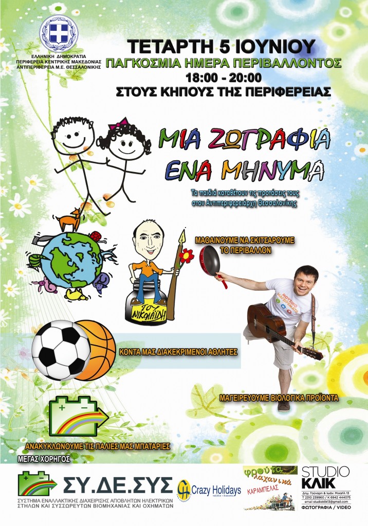 Εκδήλωση με σύνθημα «Μια ζωγραφιά, ένα μήνυμα» διοργανώνουν ο Περιφερειάρχης Κεντρικής Μακεδονίας Απόστολος Τζιτζικώστας, ο Αντιπεριφερειάρχης της Μ.Ε. Θεσσαλονίκης Γεώργιος Τσαμασλής και ο Αντιπεριφερειάρχης Περιβάλλοντος, Ενέργειας και Φυσικών Πόρων της ΠΚΜ Φάνης Παπάς, με αφορμή τον εορτασμό της Παγκόσμιας Ημέρας Περιβάλλοντος, σε συνεργασία με το Σύστημα Εναλλακτικής Διαχείρισης Αποβλήτων Ηλεκτρικών Στηλών και Συσσωρευτών Βιομηχανίας και Οχημάτων (ΣΥ.ΔΕ.ΣΥΣ.) την Τετάρτη 5 Ιουνίου 2013 στις 18.00 στους κήπους της Περιφέρειας (Βασ. Όλγας 198,Θεσσαλονίκη)