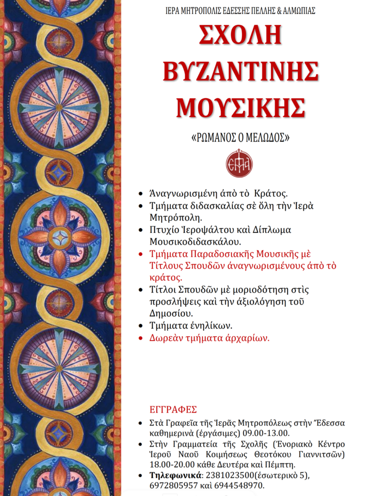 Αρχίζουν οι εγγραφές στην Σχολή Βυζαντινής Μουσικής της Ιεράς Μητροπόλεως Εδέσσης, Πέλλης και Αλμωπίας και στα τμήματα Παραδοσιακής Μουσικής για το νέο διδακτικό έτος 2024-25.