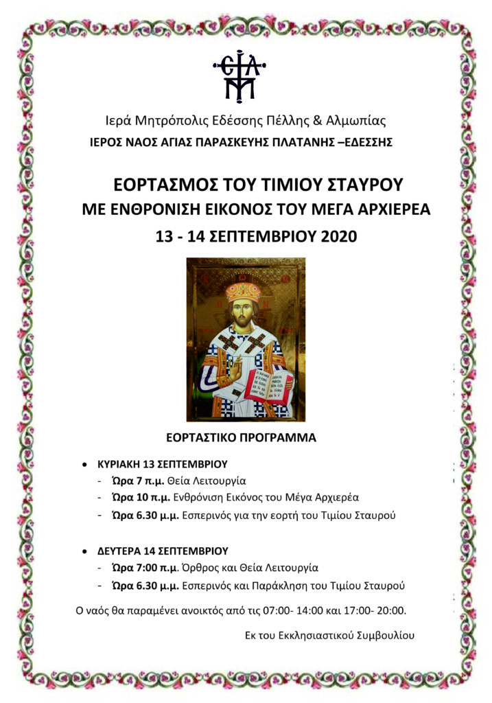 – Ώρα 6.30 μ.μ. Εσπερινός και Παράκληση του Τιμίου Σταυρού
