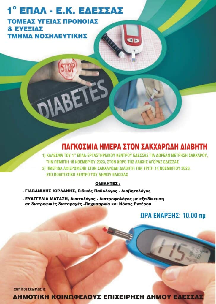 Στα πλαίσια της ίδιας δράσης θα πραγματοποιηθεί εκδήλωση -ομιλία την Τρίτη 19 Νοεμβρίου 2024 στο “φουαγιέ¨του ΕΠΑΛ Έδεσσας(κτίριο δίπλα στον Σκλαβενίτη). Στην εκδήλωση η οποία θα αρχίσει στις 10.00, θα μιλήσουν οι κκ. Γιαβανίδης Ιορδάνης Ειδικός Παθολόγος – Διαβητολόγος και Λιπαρίνης Αθανάσιος Διαιτολόγος Διατροφολόγος με εξειδίκευση στις διατροφικές διαταραχές -παχυσαρκία και νόσους του εντέρου.