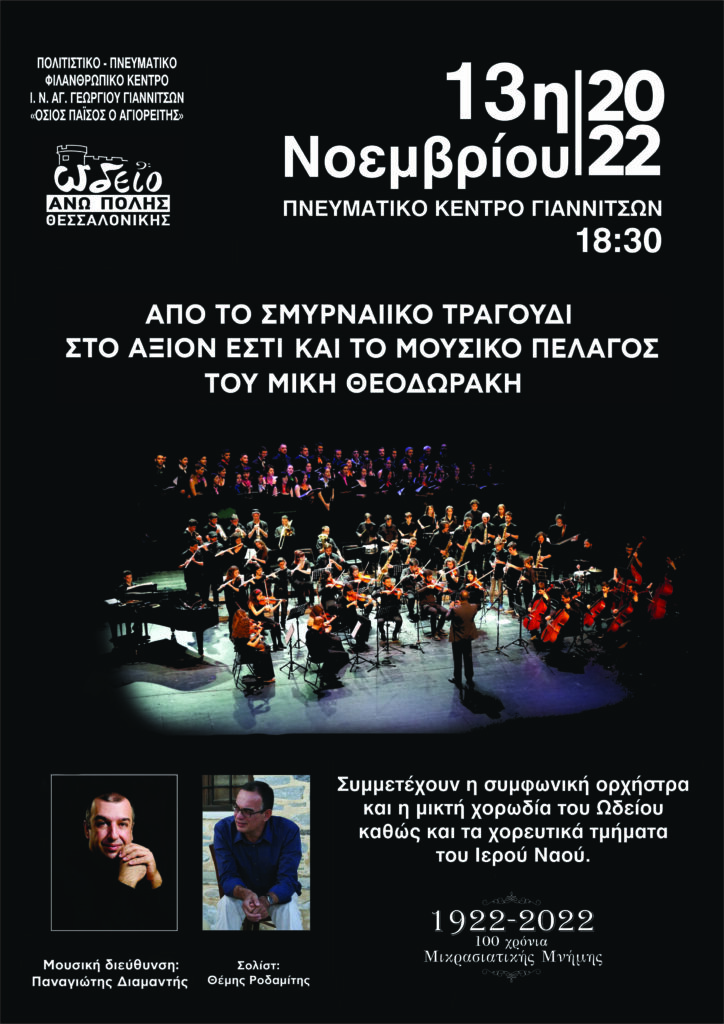 Για τα 100 χρόνια της Μικρασιατικής Καταστροφής αλλά και της πρόσφατης εκδημίας του Μίκη Θεοδωράκη, το Πολιτιστικό, Ποιμαντικό, Φιλανθρωπικό Κέντρο της ενορίας Αγ. Γεωργίου Γιαννιτσών «Όσιος Παΐσιος ο Αγιορείτης» σε συνεργασία με το Ωδείο Άνω Πόλης Θεσσαλονίκης διοργανώνει επετειακή συναυλία, στο Πνευματικό Κέντρο Γιαννιτσών την Κυριακή 13 Νοεμβρίου 2022 και ώρα 18.30, η οποία θα περιλαμβάνει τις εξής θεματικές ενότητες: