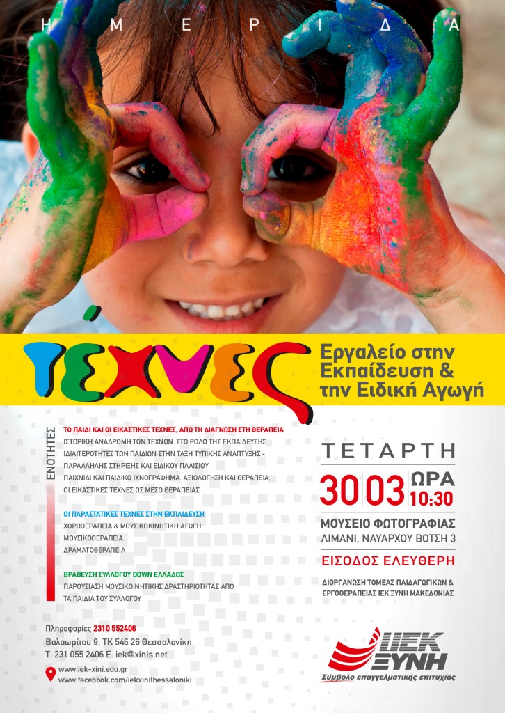 Ο Τομέας Παιδαγωγικών του Ι.ΙΕΚ ΞΥΝΗ Μακεδονίας, με σαφή προσανατολισμό στην παροχή ποιοτικής εκπαίδευσης στους σπουδαστές του, διοργανώνει την Ημερίδα με θέμα: «Τέχνες: Εργαλείο στην Εκπαίδευση & την Ειδική Αγωγή». Η Ημερίδα θα πραγματοποιηθεί την Τετάρτη 30 Μαρτίου 2016 στις 10.30, στο Μουσείο Φωτογραφίας, στο Λιμάνι Θεσσαλονίκης.
