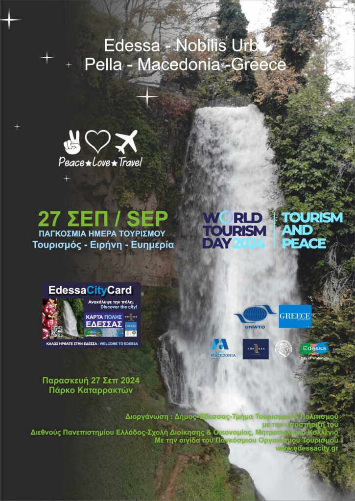 Με αφορμή την Παγκόσμια Ημέρα Τουρισμού, ο Δήμος Έδεσσας διοργανώνει μια σειρά εκδηλώσεων στο Πάρκο Καταρρακτών την Παρασκευή 27 Σεπτεμβρίου 2024, υπό την αιγίδα του Παγκόσμιου Οργανισμού Τουρισμού. Το φετινό θέμα «Τουρισμός, Ειρήνη, Ευημερία» προάγει τη σημασία του τουρισμού ως μέσου για την προώθηση της κατανόησης και της ευημερίας σε τοπικό και παγκόσμιο επίπεδο. Ο Τουρισμός είναι στενά συνδεδεμένος με την έννοια του προορισμού, μιας και ο κόσμος έχει ανάγκη την εκδρομή, το ταξίδι, στην εποχή μας.