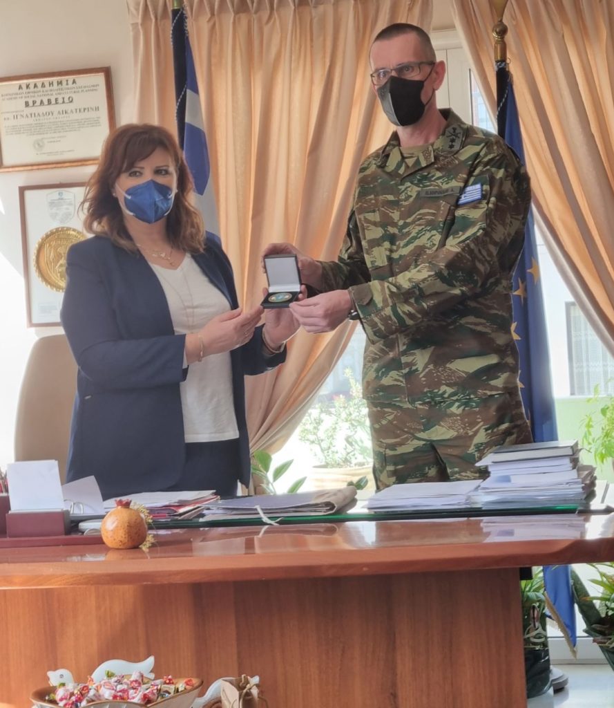 Ο Υποστράτηγος Αριστείδης Ηλιόπουλος ευχαρίστησε θερμά για την υποδοχή και την ενημέρωση και πρόσφερε στη Δήμαρχο το έμβλημα της Μεραρχίας ως αναμνηστικό.