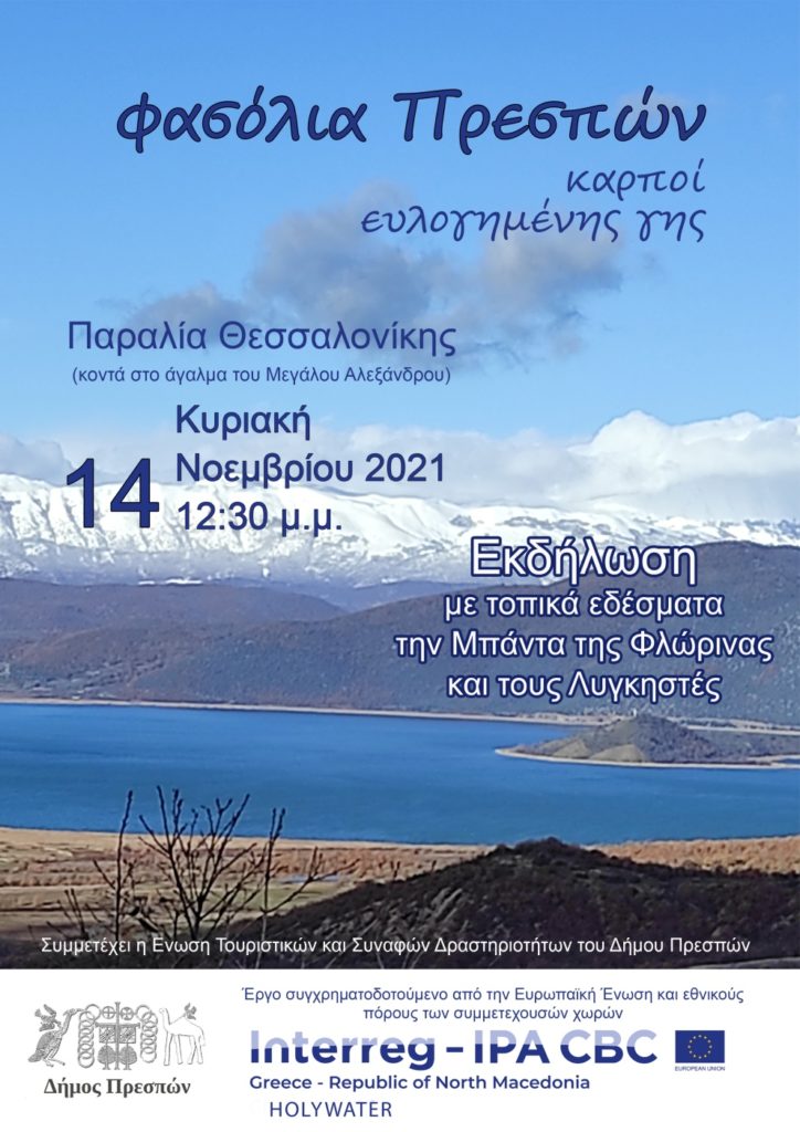 Την Κυριακή, 14 Νοεμβρίου 2021, από 12:30 έως 14:00, ο Δήμος Πρεσπών ταξιδεύει στη Θεσσαλονίκη και παρουσιάζει το μοναδικό προορισμό των Πρεσπών μαζί με τα προϊόντα του στην παραλία της Θεσσαλονίκης, κοντά στο άγαλμα του Μεγάλου Αλεξάνδρου.