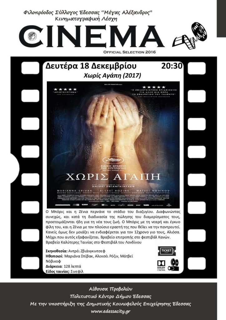 Ο Φ.Σ.Ε. «ΜΕΓΑΣ ΑΛΕΞΑΝΔΡΟΣ» (Κινηματογραφική Λέσχη), με την υποστήριξη της ΔΗ.ΚΕ.ΔΕ., τη Δευτέρα 18 Δεκεμβρίου 2017 στις 8:30 μ.μ., στο Πολιτιστικό Κέντρο του Δήμου Έδεσσας (αίθουσα προβολών) θα προβάλλει την ταινία: