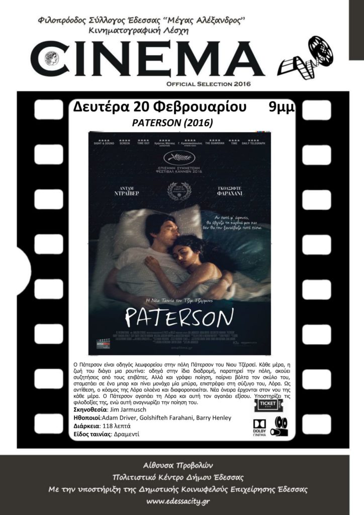 Κινηματοθέατρο Μέγας Αλέξανδρος Δευτέρα 20 Φεβρουαρίου 9μμ PATERSON (2016)