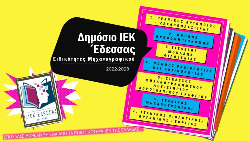 Το Δημόσιο ΙΕΚ Έδεσσας συμμετέχει και φέτος στο Παράλληλο Μηχανογραφικό με επτά (7) ειδικότητες αιχμής, οι οποίες υπόσχονται στους αποφοίτους υψηλά ποσοστά απορρόφησης στην αγορά εργασίας: