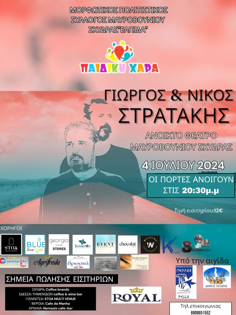 Η Πέλλα ανταμώνεται με την Κρήτη στο Δημοτικό Θέατρο Μαυροβουνίου Σκύδρας, την Πέμπτη 4 Ιουλίου 2024, στις 21:00΄, όπου οι Κρητικοί καλλιτέχνες Γιώργος και Νίκος Στρατάκης μας υπόσχονται μια αξέχαστη μουσική βραδιά.