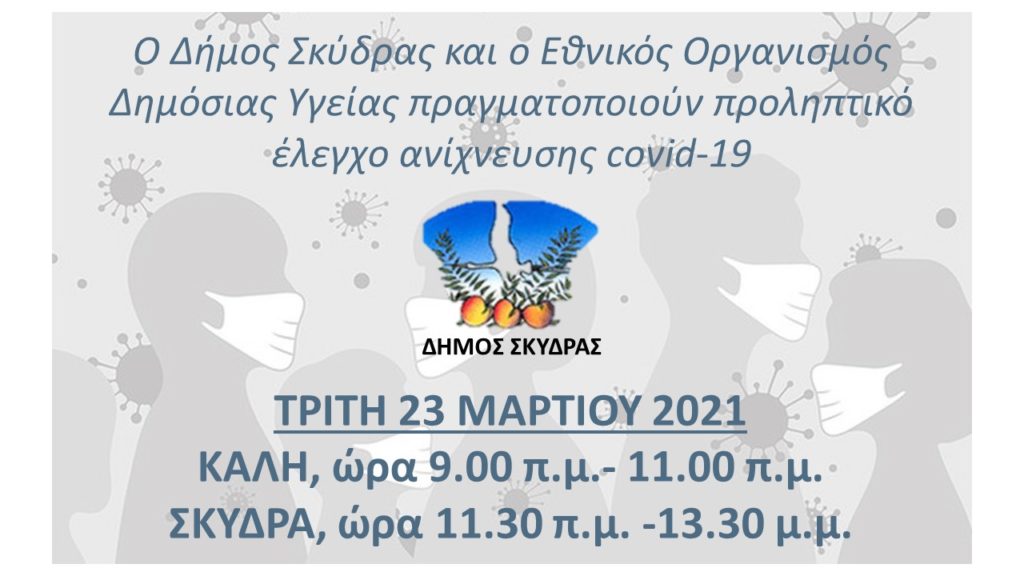 Ο Δήμος Σκύδρας ανακοινώνει ότι ο Εθνικός Οργανισμός Δημόσιας Υγείας (Ε.Ο.Δ.Υ.) συνεχίζει την πραγματοποίηση των δωρεάν εξετάσεων για την ανίχνευση κρουσμάτων κορωνοϊού στο Δήμο Σκύδρας και συγκεκριμένα στους κατοίκους της Καλής και της Σκύδρας.