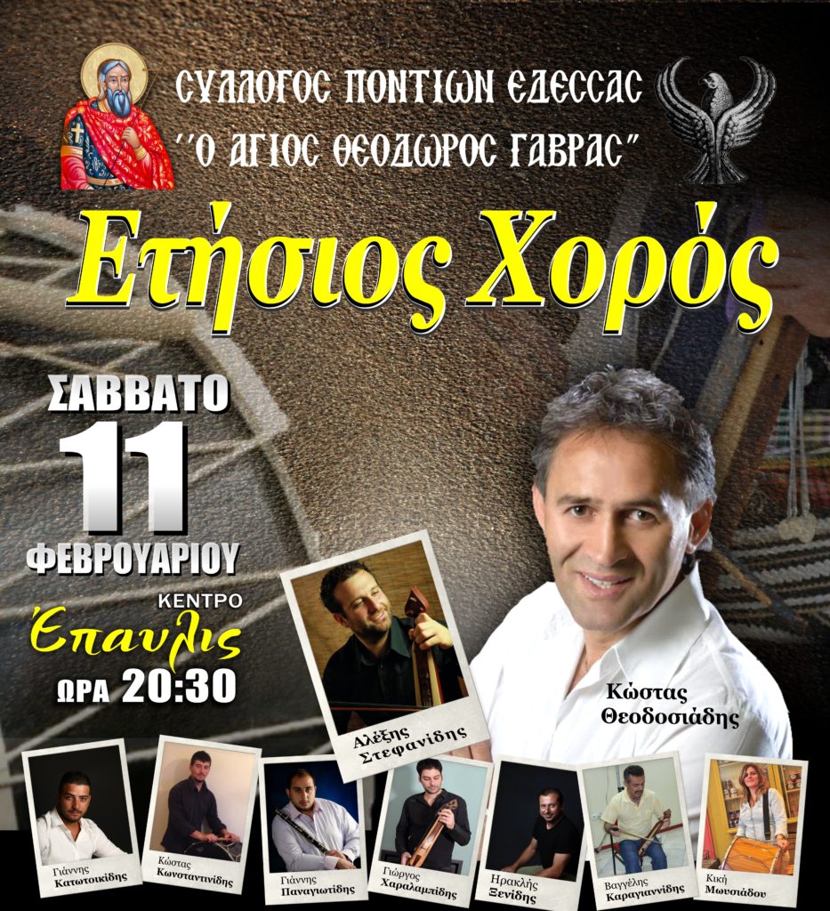 Ο Σύλλογος Ποντίων Έδεσσας “Θεόδωρος Γαβράς” σας προσκαλεί στον ετήσιο χορό στο Κέντρο Έπαυλις το Σάββατο 11 Φλεβάρη