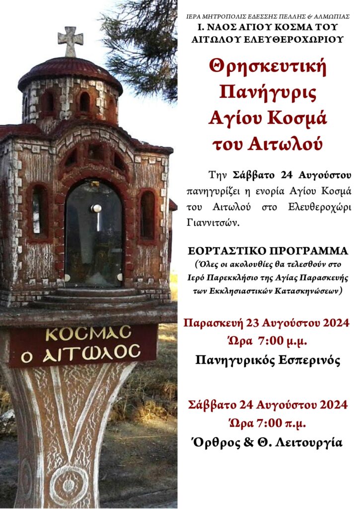 Την Πέμπτη 24 Αυγούστου πανηγυρίζει η ενορία Αγίου Κοσμά του Αιτωλού στο Ελευθεροχώρι Γιαννιτσών.
