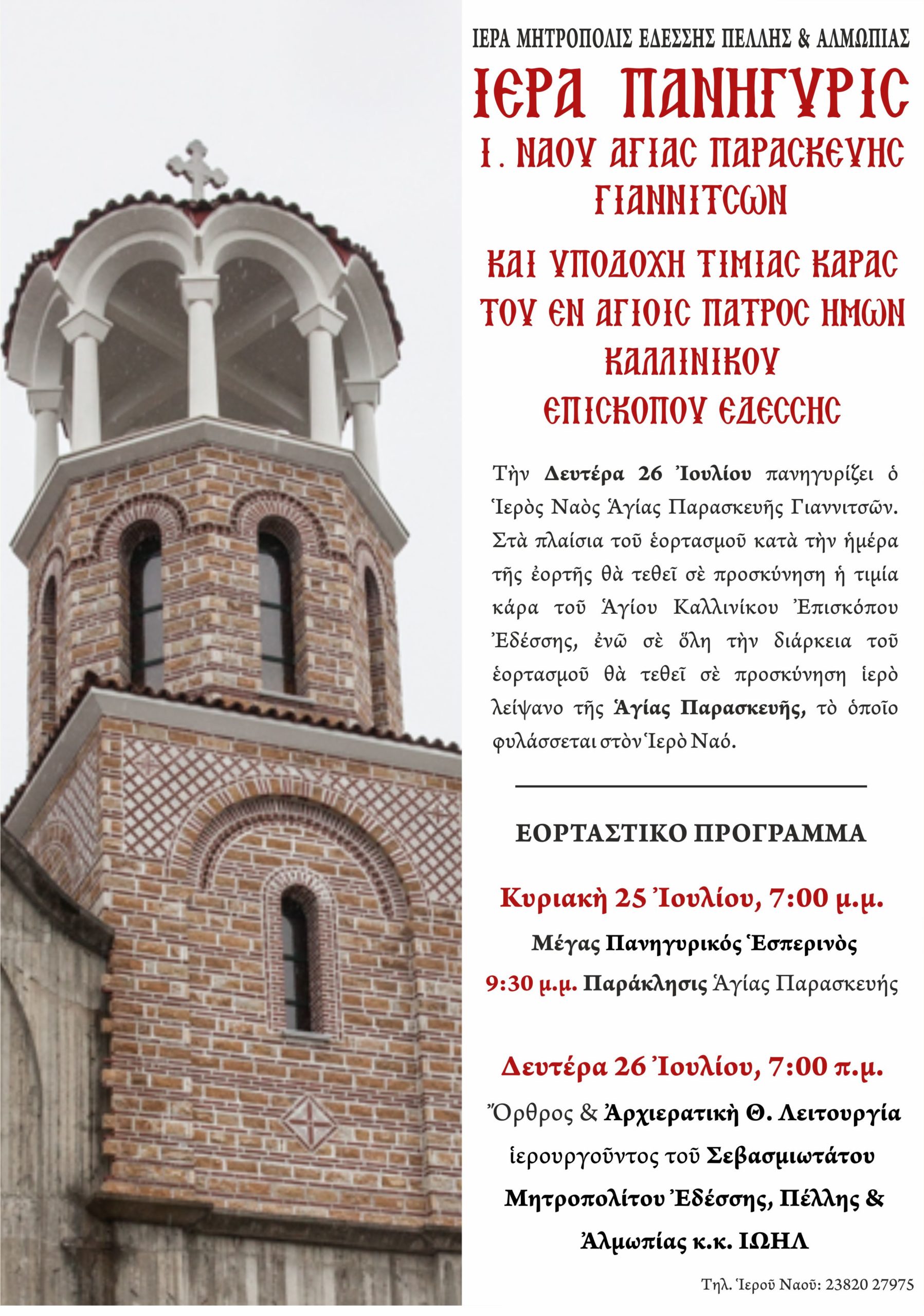 Την Δευτέρα 26 Ιουλίου 2021 πανηγυρίζει ο Ιερός Ναός Αγίας Παρασκευής Γιαννιτσών. Στα πλαίσια του εορτασμού κατά την ημέρα της εορτής θα τεθεί σε προσκύνηση η τιμία κάρα του Αγίου Καλλινίκου επισκόπου Εδέσσης, ενώ σε όλη την διάρκεια του εορτασμού θα τεθεί σε προσκύνηση ιερό λείψανο της Αγίας Παρασκευής, το οποίο φυλάσσεται στον Ιερό Ναό.