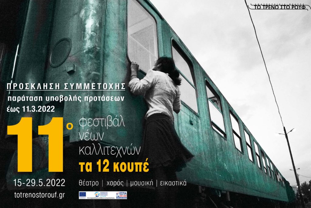 Το Φεστιβάλ Νέων Καλλιτεχνών «τα 12 Κουπέ», πιστό στο ετήσιο ανοιξιάτικο ραντεβού του από τον Μάιο 2011, οργανώνεται και φέτος στην Αμαξοστοιχία – Θέατρο το Τρένο στο Ρουφ για 11η χρονιά και καλεί νέους καλλιτέχνες να δημιουργήσουν καινοτομικά projects σύντομης διάρκειας (10-30 λεπτών) και να τα παρουσιάσουν καθημερινά επί ένα συνεχές δεκαπενθήμερο, από την Κυριακή 15 Μαΐου έως και την Κυριακή 29 Μαΐου 2022.