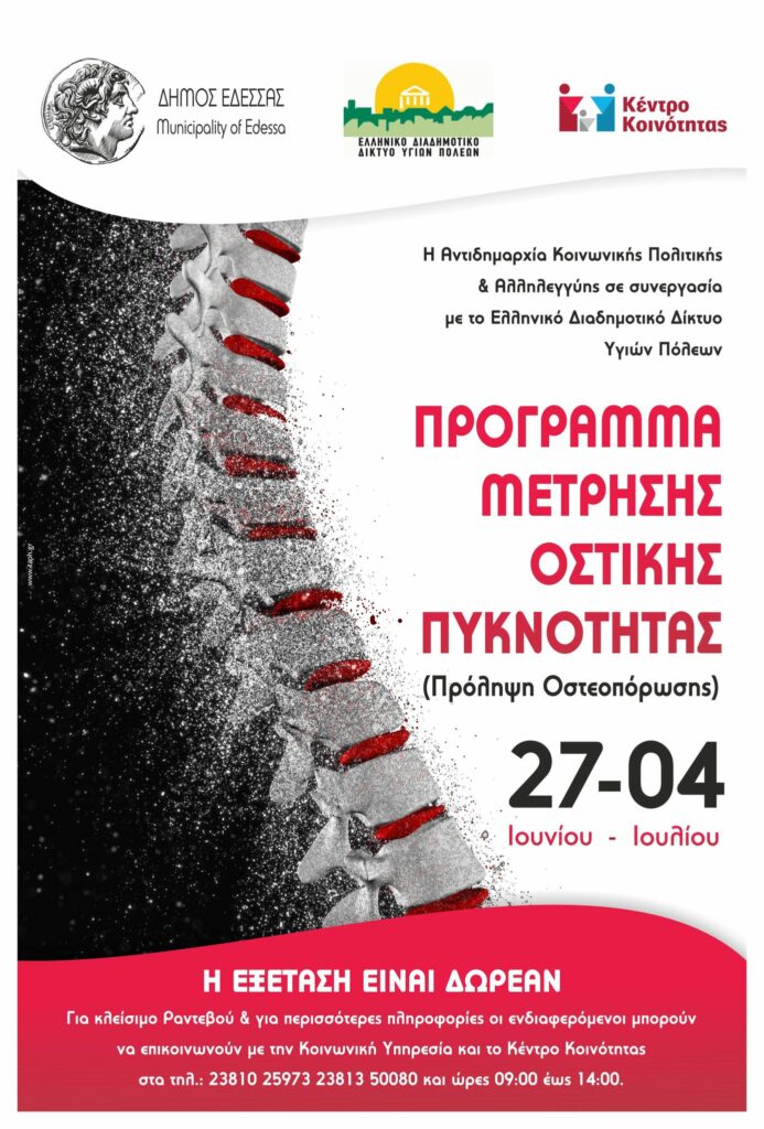 Με πρωτοβουλία της Αντιδημαρχίας Κοινωνικής Πολιτικής & Αλληλεγγύης του Δήμου Έδεσσας και σε συνεργασία με το Ελληνικό Διαδημοτικό Δίκτυο Υγιών Πόλεων (ΕΔΔΥΠΠΥ) και το Κέντρο Κοινότητας του Δήμου Έδεσσας, διοργανώνεται πρόγραμμα μέτρησης οστικής πυκνότητας για την πρόληψη της οστεοπόρωσης.