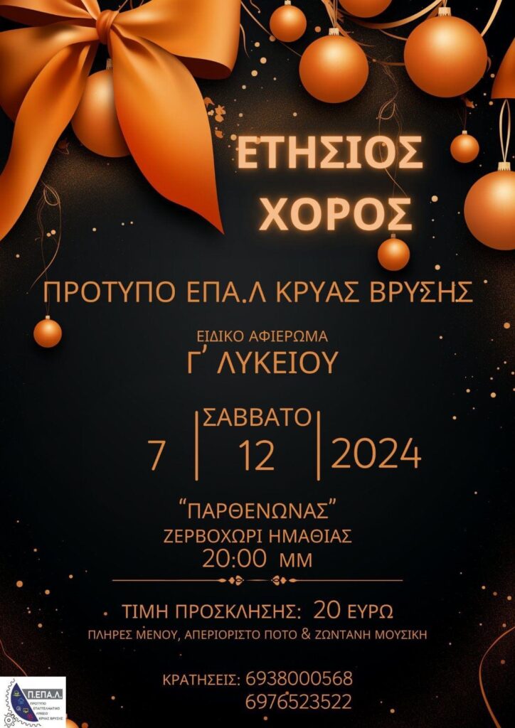 Ο Σύλλογος Γονέων και Κηδεμόνων του Πρότυπου Επαγγελματικού Λυκείου Κρύας Βρύσης σας προσκαλεί σε μια μοναδική βραδιά γεμάτη διασκέδαση, μουσική και γεύσεις! Ο ετήσιος χορός του ΠΕΠΑΛ Κρύας Βρύσης θα πραγματοποιηθεί το Σάββατο 7 Δεκεμβρίου 2024, στις 20:00, στο φιλόξενο χώρο του κέντρου Παρθενώνας στο Ζερβοχώρι Ημαθίας.
