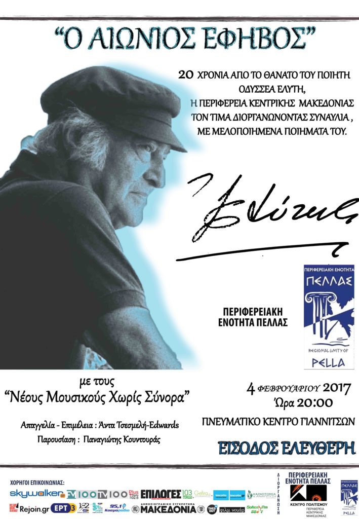 Φέτος συμπληρώνονται 20 χρόνια από τον θάνατο του Ελύτη(1911-1996) και το Κέντρο Πολιτισμού της Περιφέρειας Κεντρικής Μακεδονίας σε συνεργασία με την Περιφερειακή Ενότητα Πέλλας τον τιμούν διοργανώνοντας μια μουσική εκδήλωση, με μια δυναμική νεανική ορχήστρα τους «Νέους Μουσικούς Χωρίς Σύνορα» . Θα ακουστούν απαγγελίες ποιημάτων αλλά και μελοποιημένα ποιήματα του ποιητή από τους «Προσανατολισμούς», τον «Ήλιο τον Ηλιάτορα», «Τα Ρω του έρωτα», και το «Άξιον Εστί».