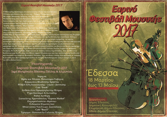 Το Εαρινό Φεστιβάλ Μουσικής Έδεσσας είναι ένας θεσμός που επαναλειτουργεί για δεύτερη συνεχόμενη χρονιά από το Ωδείο Έδεσσας και τη Δημοτική Κοινωφελή Επιχείρηση Δήμου Έδεσσας. Πρέπει να τονιστεί η εξαιρετική σημασία του γεγονότος ότι ο κόσμος της περιοχής στηρίζει τον θεσμό και συμμετέχει ενεργά στις εκδηλώσεις που αναβαθμίζουν τη μουσική παιδεία της περιοχής μας.