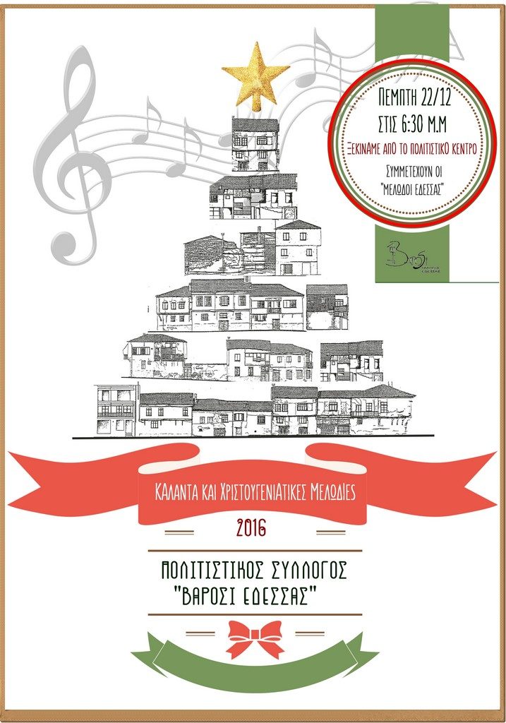 Την Πέμπτη 22 Δεκεμβρίου 2016 και ώρα 6:30 το απόγευμα, πιστοί στο ραντεβού και κόντρα στην απαισιοδοξία της εποχής, θα ψάλλουν τα κάλαντα και χριστουγεννιάτικες μελωδίες στην αγαπημένη γειτονιά το «Βαρόσι», σε συνεργασία με τη μουσική ομάδα «Οι μελωδοί της Έδεσσας». Θα ξεκινήσουν από το Πολιτιστικό Κέντρο του Δήμου Έδεσσας και θα περιδιαβούν στα σοκάκια του «Βαροσίου», με κατεύθυνση τον πεζόδρομο της πόλης.