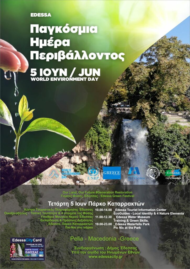 Με επιτυχία ολοκληρώθηκαν οι εκδηλώσεις για την Παγκόσμια Ημέρα Περιβάλλοντος υπό την αιγίδα των Ηνωμένων Εθνών και του Προγράμματος για το περιβάλλον με θέμα «Η γή μας, το μέλλον μας». Στους δρόμους του νερού περιηγήθηκαν δεκάδες μαθητές την Παγκόσμια Ημέρα Περιβάλλοντος με οικοξεναγήσεις στο Πάρκο Καταρρακτών, το Υπαίθριο Μουσείο Νερού, την συνοικία του νερού στο Βαρόσι και στα δέντρα του νερού, τα «πλατάνια» αρκετά από τα οποία είναι χαρακτηρισμένα μνημεία της φύσης δίπλα στους Καταρράκτες Έδεσσας. Για την ημέρα αυτή ο δήμαρχος Έδεσσας Γιάννης Τσεπκεντζής σε μήνυμα του τόνισε ότι “η φύση και η φυσική κληρονομιά της Έδεσσας αποτελεί προτεραιότητα για όλους τους Εδεσσαίους και τις Εδεσσαίες ένα δώρο που απλόχερα δίνεται και στους επισκέπτες. Η φροντίδα της φύσης είναι φροντίδα στον εαυτό μας και κυρίως στο μέλλον μας”.