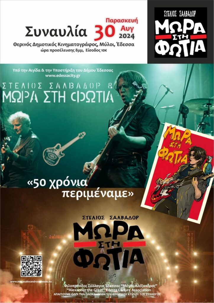Από τα πιο επιδραστικά, ιστορικά  συγκροτήματα της ελληνικής ροκ μουσικής σκηνής, τα “ΜΩΡΑ ΣΤΗ ΦΩΤΙΑ“, θα ροκάρουν την Παρασκευή 30 Αυγούστου 2024, στο θερινό δημοτικό κινηματογράφο, στην Έδεσσα, με πρωτοβουλία του Φιλοπρόοδου Συλλόγου ‘Εδεσσας “Μέγας Αλέξανδρος” και υπό την αιγίδα  του Δήμου Έδεσσας.