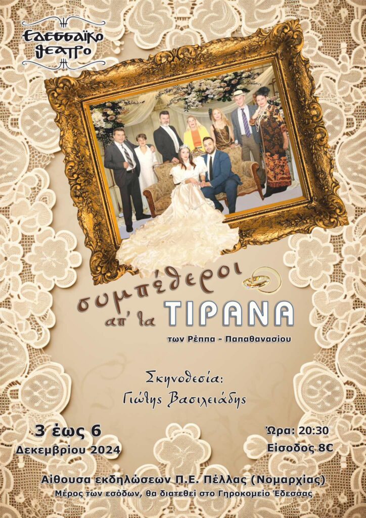 Το Εδεσσαϊκό Θέατρο παρουσιάζει την κωμωδία «Συμπέθεροι από τα Τίρανα» σε σκηνοθεσία του Γιώτη Βασιλειάδη. Πρόκειται για μια μοντέρνα κωμωδία, με ανατροπές και κωμικές καταστάσεις.