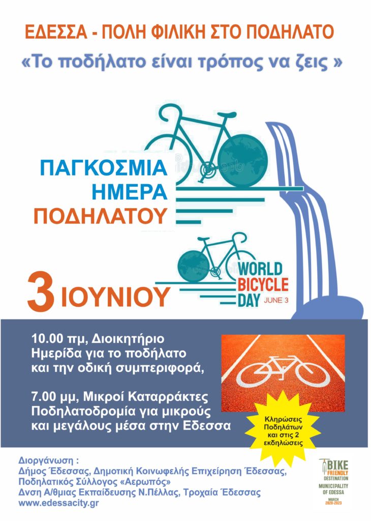 Ο Δήμος Έδεσσας, η Δημοτική Κοινωφελής Επιχείρηση Δήμου Έδεσσας (ΔΗΚΕΔΕ), η Τροχαία Έδεσσας, η Διεύθυνση Πρωτοβάθμιας Εκπαίδευσης Ν. Πέλλας και ο Ποδηλατικός Σύλλογος «Αερωπός» διοργανώνουν εκδηλώσεις με τίτλο ΕΔΕΣΣΑ – ΠΟΛΗ ΦΙΛΙΚΗ ΣΤΟ ΠΟΔΗΛΑΤΟ και σύνθημα «Το ποδήλατο είναι τρόπος να ζεις»!