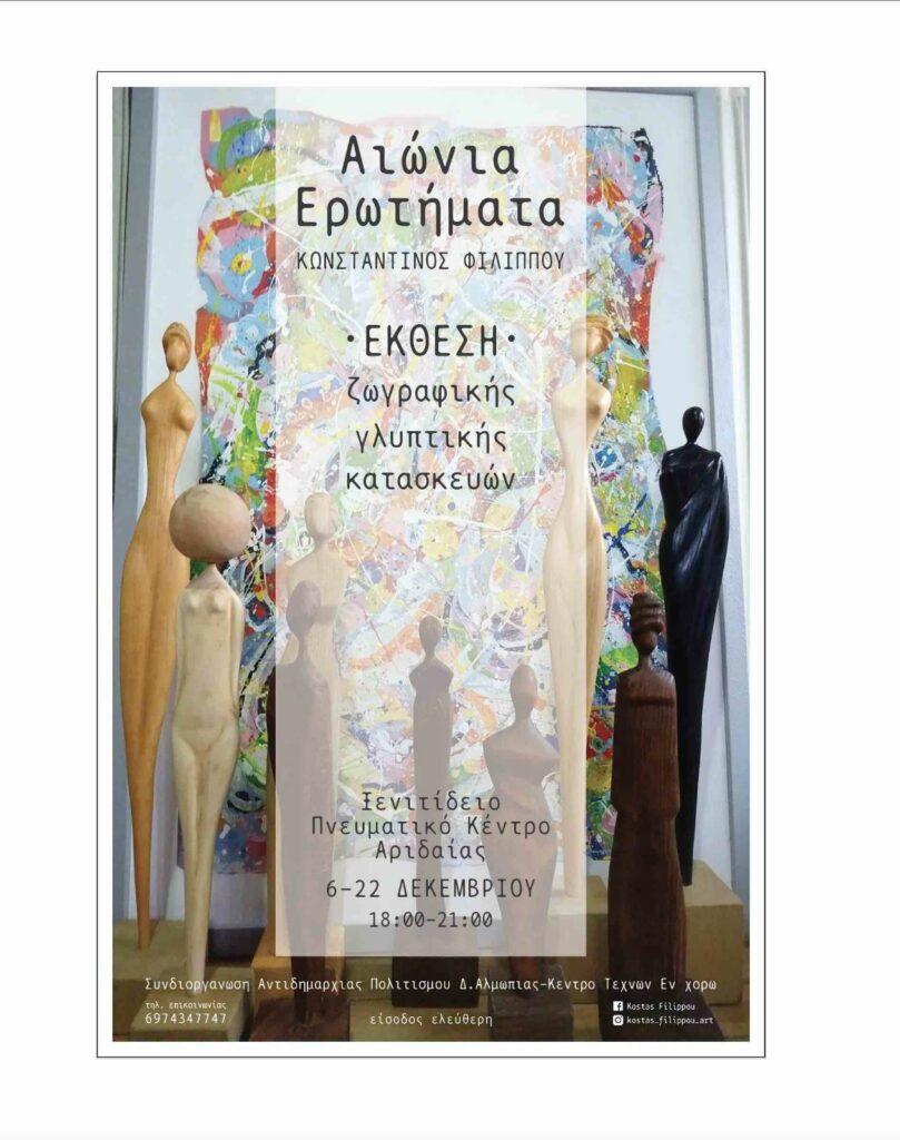 Μια ιδιαίτερη Έκθεση Σύγχρονης Τέχνης του εικαστικού καλλιτέχνη Κωνσταντίνου Φιλίππου φιλοξενείται στο Φουαγιέ του Ξενιτίδειου Πνευματικού Κέντρου Αριδαίας μέχρι την Κυριακή 22 Δεκεμβρίου. Η έκθεση λειτουργεί όλες αυτές τις ημέρες από τις 18.00 έως τις 21.00.
