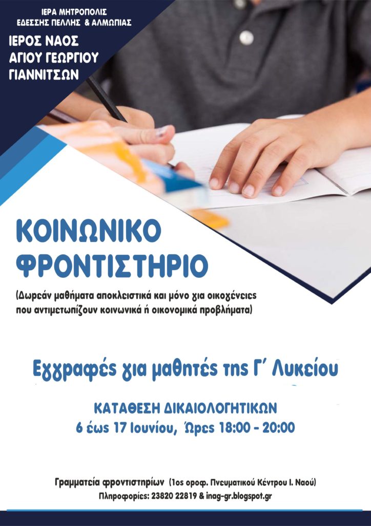 Από την 6η Ιουνίου 2022 ξεκινούν οι εγγραφές για τους μαθητές της Γ΄ Λυκείου στα δωρεάν φροντιστηριακά μαθήματα που διοργανώνει η ενορία Αγίου Γεωργίου Γιαννιτσών για το σχολικό έτος 2022-2023. Οι εγγραφές αφορούν αποκλειστικά και μόνο οικογένειες που αντιμετωπίζουν κοινωνικά ή οικονομικά προβλήματα.