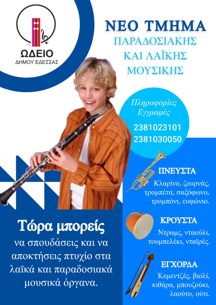 Μία νέα Σχολή προστέθηκε στο Δημοτικό Ωδείο Δήμου Έδεσσας !!!! Με το ΦΕΚ 77/Β/2022 δόθηκε η δυνατότητα στα αναγνωρισμένα Ωδεία, η ίδρυση Σχολών Παραδοσιακής Μουσικής όπου μπορούν να διδάσκονται παραδοσιακά μουσικά όργανα.