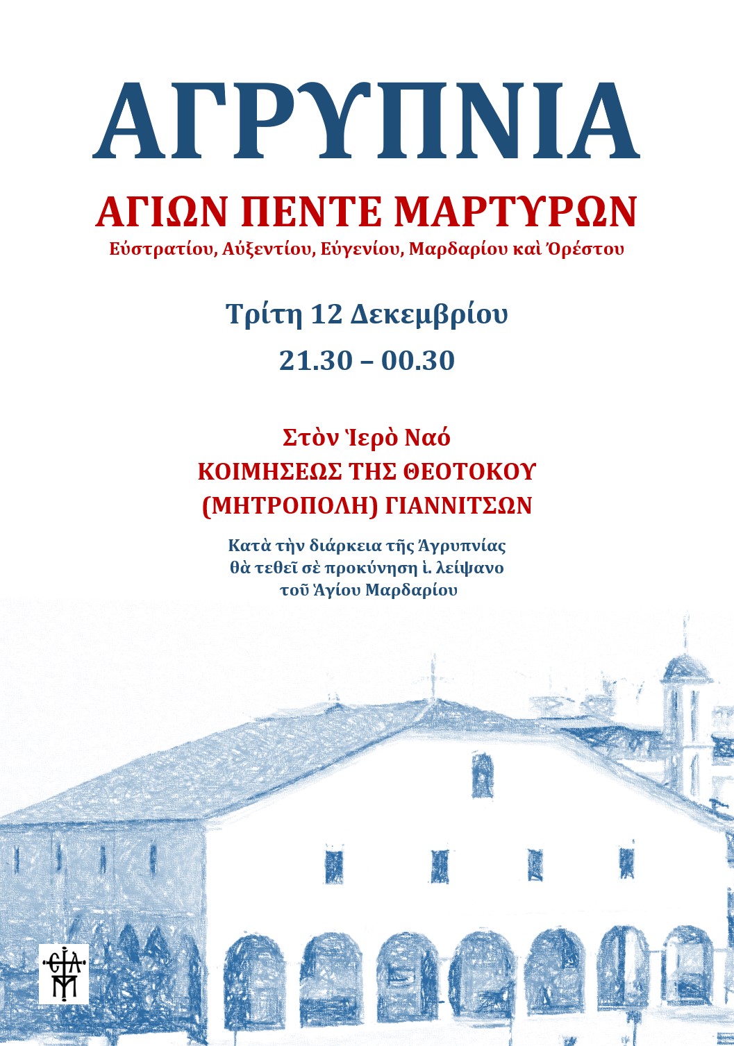Την Τρίτη 12 Δεκεμβρίου από 21.30 έως 00.30 θα τελεσθεί ιερά Αγρυπνία (Εσπερινός, Όρθρος και Θεία Λειτουργία) για την μνήμη των Αγίων Πέντε Μαρτύρων, Ευστρατίου, Αυξεντίου, Ευγενίου, Μαρδαρίου και Ορέστου, στον Ιερό Ναό Κοιμήσεως της Θεοτόκου (Μητρόπολη) Γιαννιτσών.