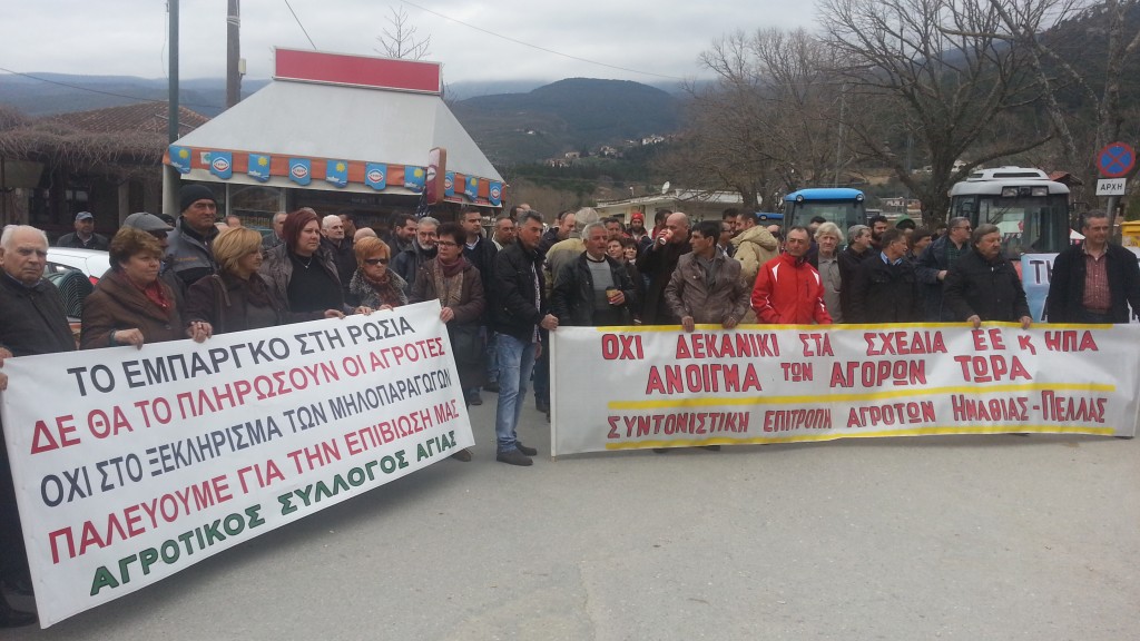 Οι συγκεντρωμένοι αγρότες, παραγωγοί μήλων, εκτιμάμε ότι το εμπάργκο της Ε.Ε στην Ρωσία αποτελεί ισχυρό πλήγμα στην διάθεση και στην τιμή πώλησης της παραγωγής μας, στο εισόδημα μας. Αντιμετωπίζουμε πρόβλημα επιβίωσης καθώς η παραγωγή μας, είτε παραμένει αδιάθετη στα ψυγεία, είτε έχει διατεθεί σε χαμηλές τιμές και υπάρχουν πολλοί παραγωγοί απλήρωτοι.