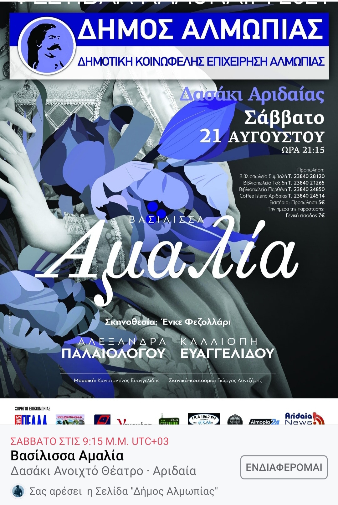 Ανακοίνωση Δ.Η.Κ.Ε. Αλμωπίας για αναβολή της παράστασης Βασίλισσα Αμαλία στην Αριδαία - Νέα ημερομηνία