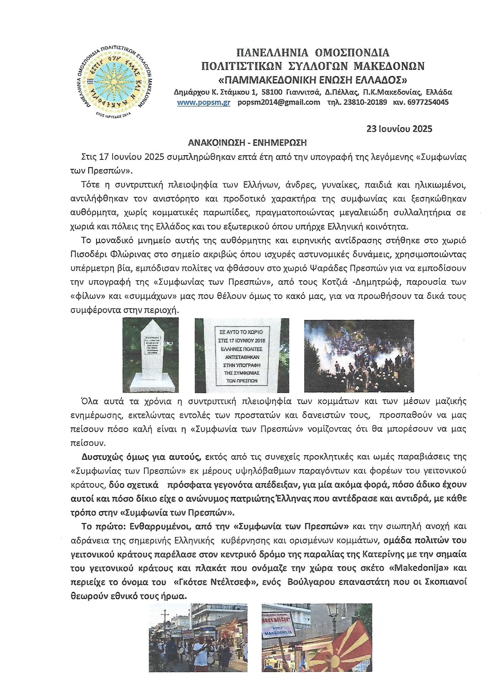 Στις 17 Ιουνίου 2025 συμπληρώθηκαν επτά έτη από την υπογραφή της λεγόμενης «Συμφωνίας των Πρεσπών».