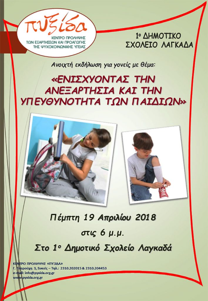 Η εκδήλωση, η οποία πραγματοποιείται μετά από αίτημα της Διεύθυνσης του σχολείου, θα γίνει αύριο, Πέμπτη 19 Απριλίου 2018, στις 6 μ.μ., στο 1ο Δημοτικό Σχολείο Λαγκαδά, και με θέμα: «Ενισχύοντας την ανεξαρτησία και την υπευθυνότητα των παιδιών».