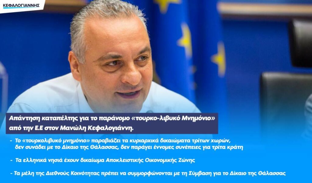 Ο Μανώλης Κ. Κεφαλογιάννης με αφορμή την υπογραφή μεταξύ της Λιβύης και της Τουρκίας στις 3 Οκτωβρίου της συμφωνίας μίσθωσης της Αποκλειστικής Οικονομικής Ζώνης της Λιβύης, έτσι όπως αυτή οριοθετήθηκε με το παράνομο και άκυρο τουρκολιβυκό μνημόνιο, σε τουρκικές εταιρείες για πραγματοποίηση ερευνών για πετρέλαιο και φυσικό αέριο είχε καταθέσει σχετική ερώτηση ζητώντας τη λήψη μέτρων για τη συμφωνία αυτή. Μία συμφωνία που παραβιάζει τα κυριαρχικά δικαιώματα της Ελλάδας, ενός πλήρους μέλους της Ευρωπαϊκής Ένωσης.