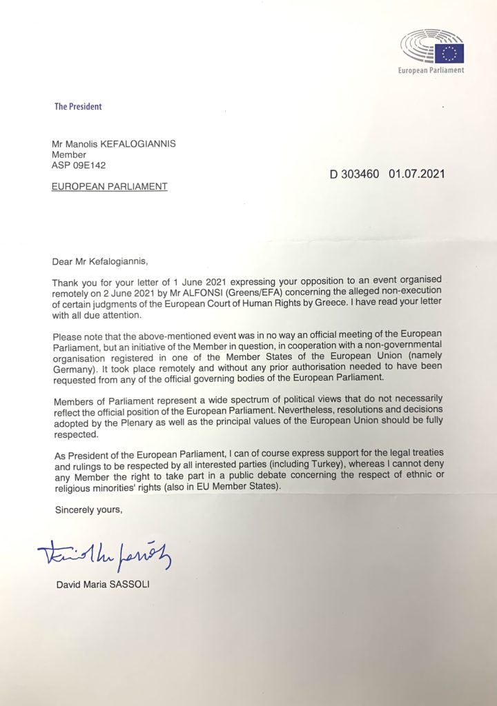 Σας ευχαριστούμε για την επιστολή σας που εκφράσατε την αντίθεσή σας σε μια εκδήλωση που διοργανώθηκε εξ αποστάσεως σχετικά με την εικαζόμενη μη εκτέλεση ορισμένων αποφάσεων  του Ευρωπαϊκού Δικαστηρίου Ανθρωπίνων Δικαιωμάτων από την Ελλάδα. Έχω διαβάσει την επιστολή σας με όλη τη δέουσα προσοχή.