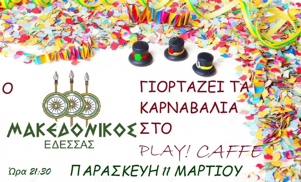 Ο Μακεδονικός Έδεσσας σας προσκαλεί να γιορτάσουμε όλοι μαζί τα Καρναβάλια στο Play! Caffe στην Έδεσσα (Αγγ. Γάτσου 14) την Παρασκευή 11 Μαρτίου.